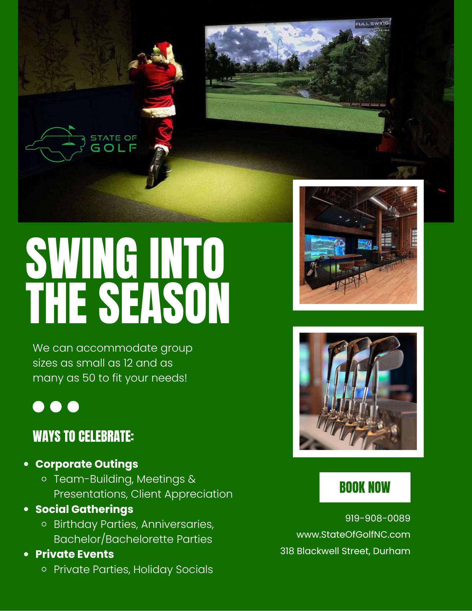 We’re all about merging indoor golf with entertainment. Our cutting-edge simulators powered by Full Swing Golf come together with upscale events, fantastic amenities, and carefully crafted cocktails. State of Golf NC creates a lively, interactive, and enjoyable environment for golf lovers, sports enthusiasts, and anyone looking to have a great time.